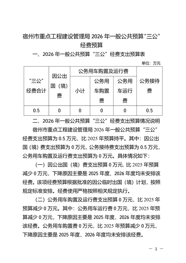 宿州市重点工程建设管理局2026年一般公共预算“三公”经费预算